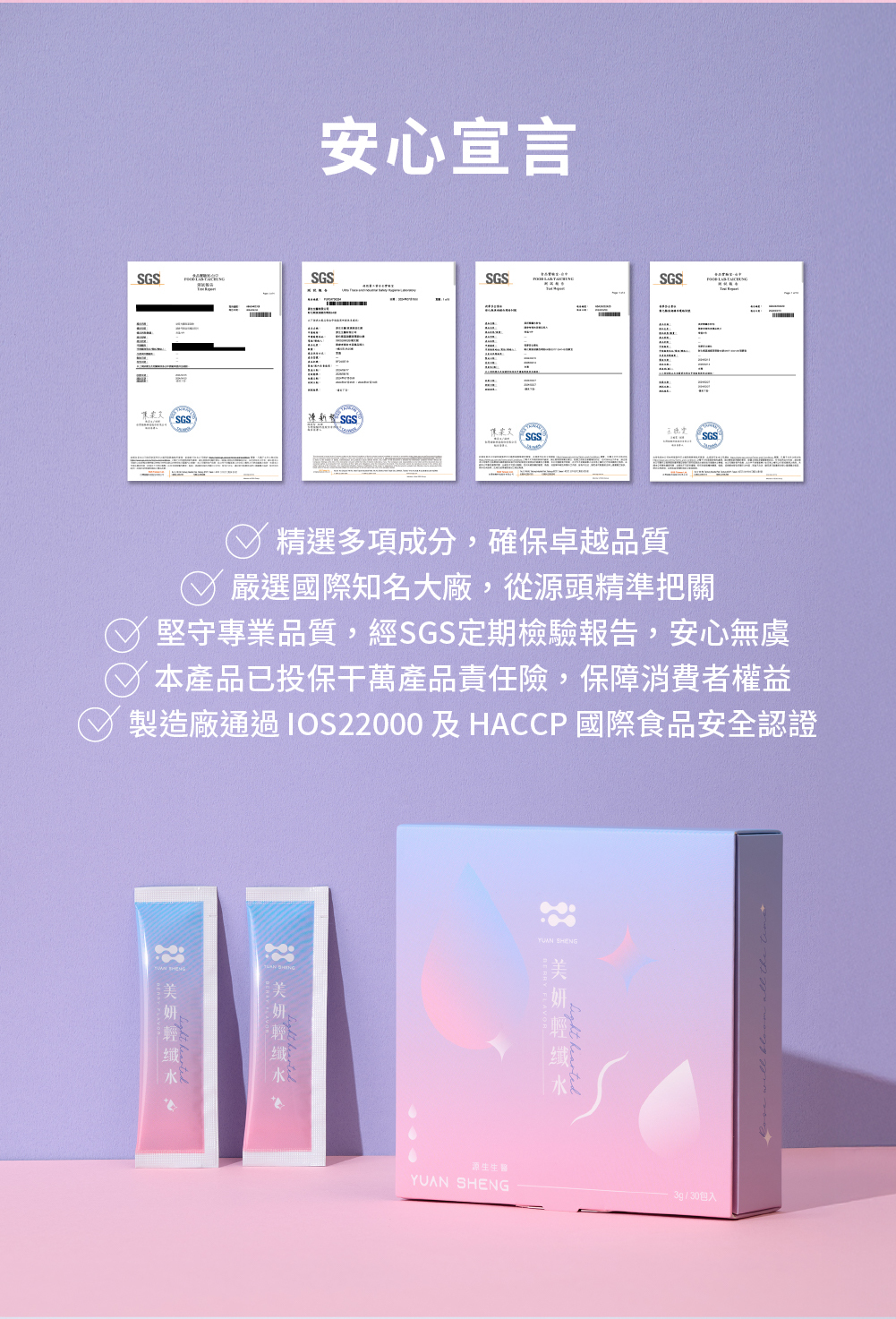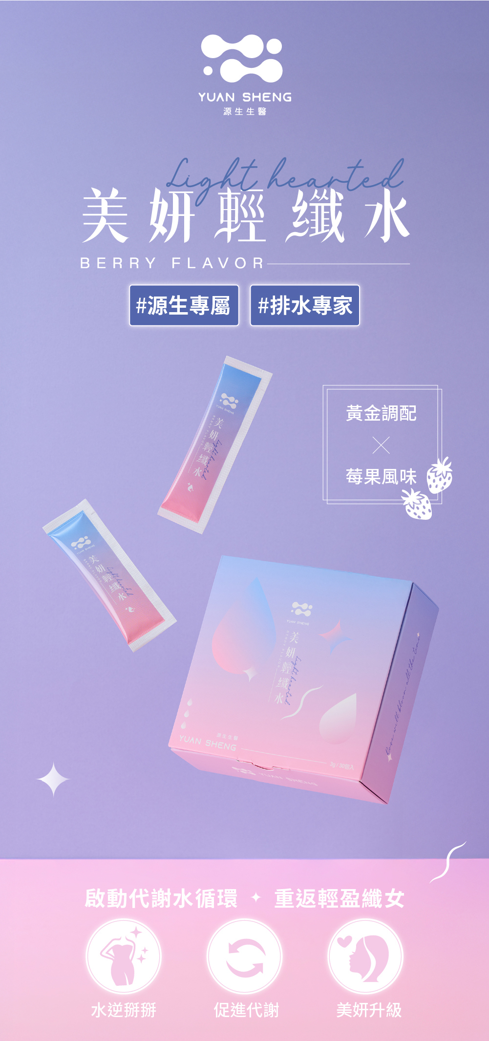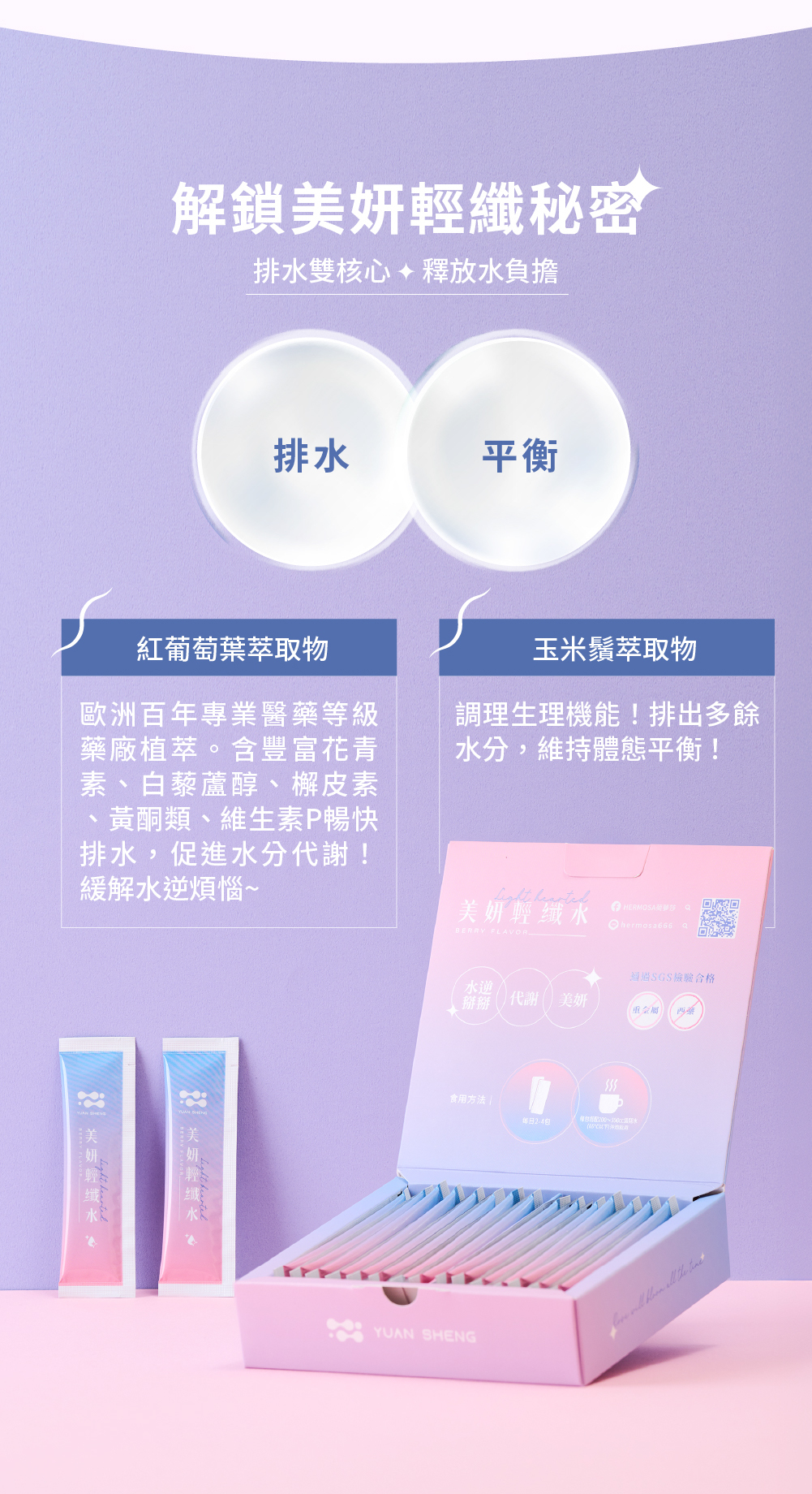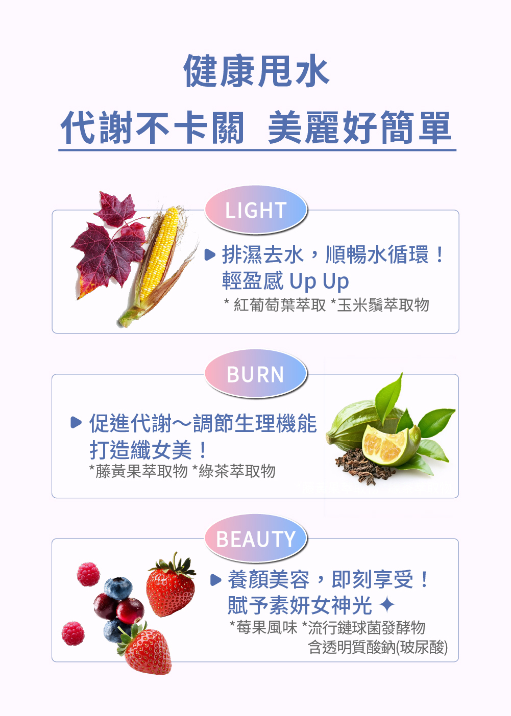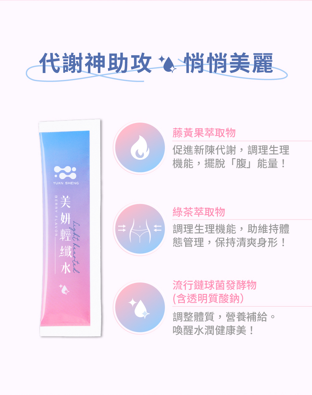 品名:美妍輕纖水 成分:即溶綜合莓粉(砂糖、濃縮果汁(草莓濃縮汁、蔓越莓濃縮汁、藍莓濃縮汁、覆盆莓濃縮汁)、麥芽糊精、氧化澱粉、 香料、檸檬酸、檸檬酸鈉、婀娜多色素、紅甜菜濃縮汁)、菊糖、玉米鬚萃物(玉米鬚萃取物、玉米糊精)、氯化鉀、無水 檸檬酸(無水檸檬酸、二氧化矽、羧甲基纖維素鈉)、紅葡萄葉萃取物(紅葡萄葉萃取物、阿拉伯膠)、藤黃果抽出物、綠茶 萃取物(綠茶萃取物、麥芽糊精)、二氧化矽、玫瑰香料粉(葡萄糖、二氧化矽、丙二醇、香料)、流行鏈球菌發酵物(含透明 質酸鈉)、蔗糖素(甜味劑)