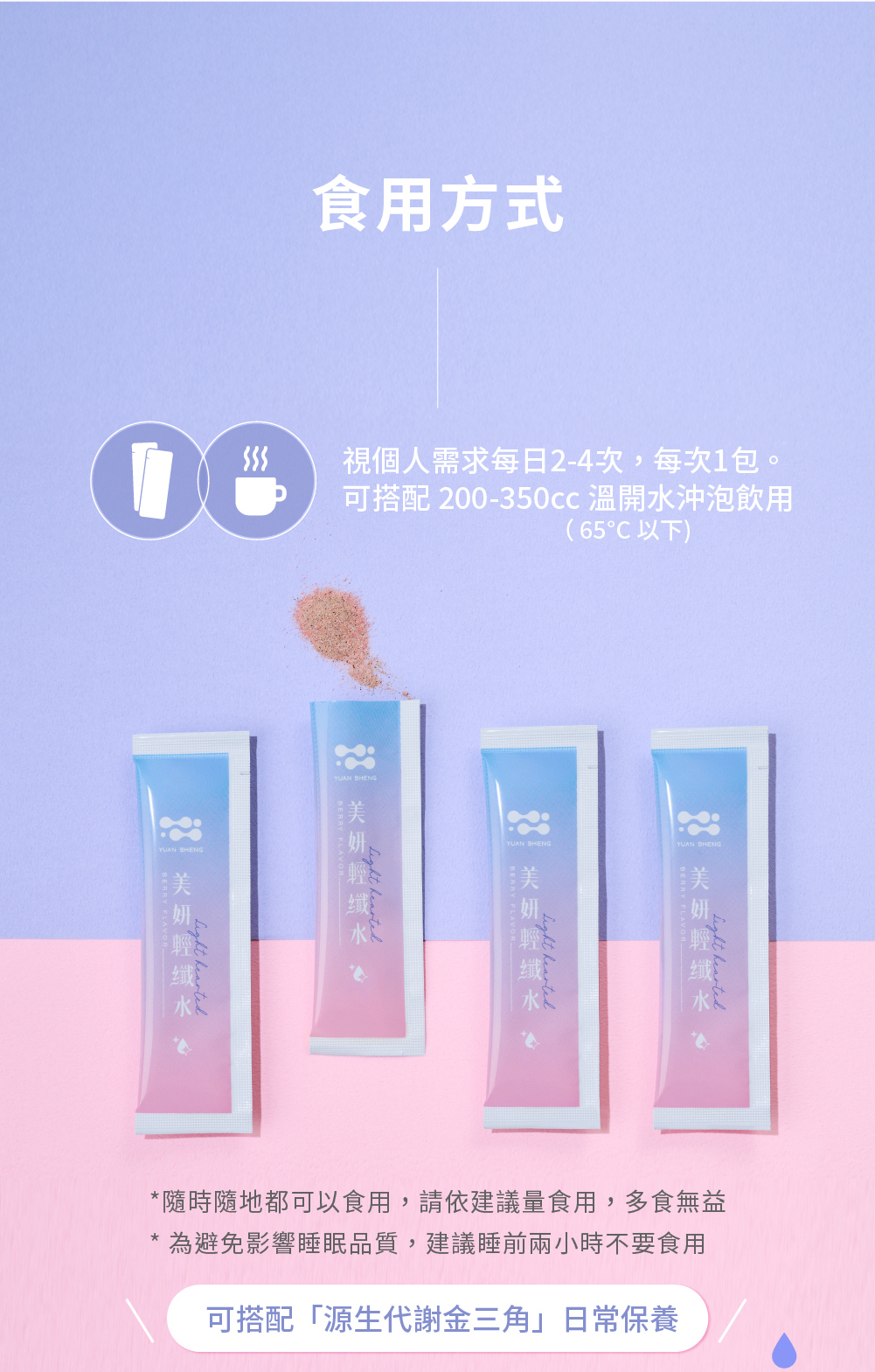 視個人需求每日2~4次,每次1包,可搭配200~350cc 溫開水(65°C以下)沖泡飲用。