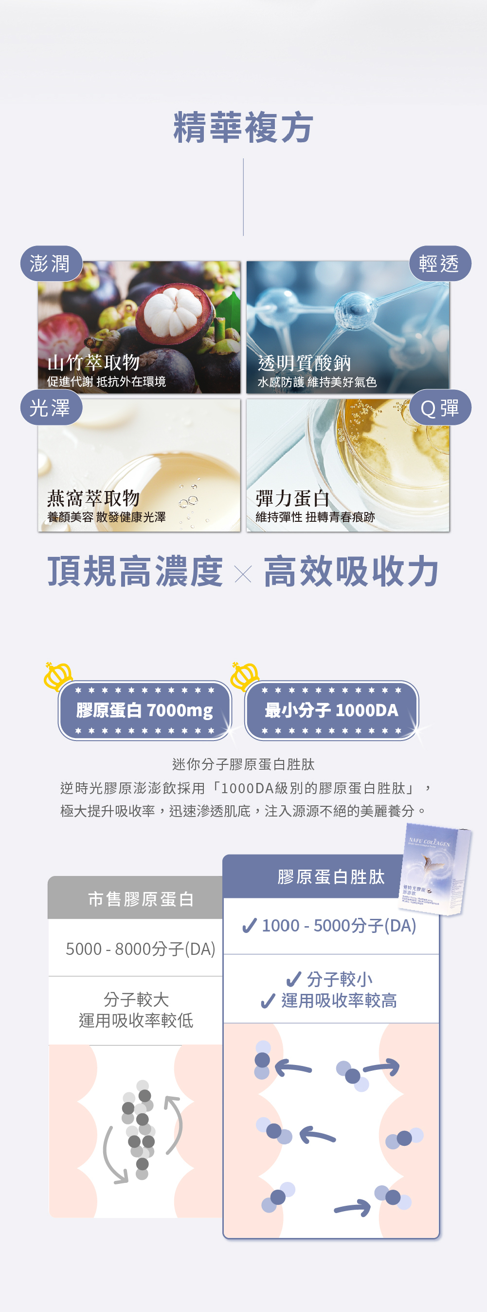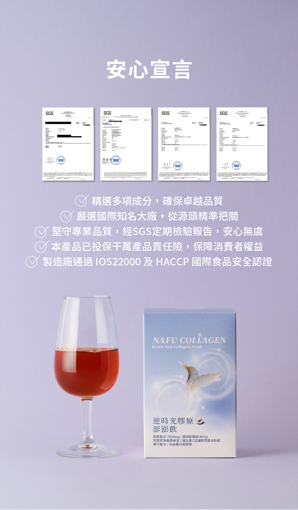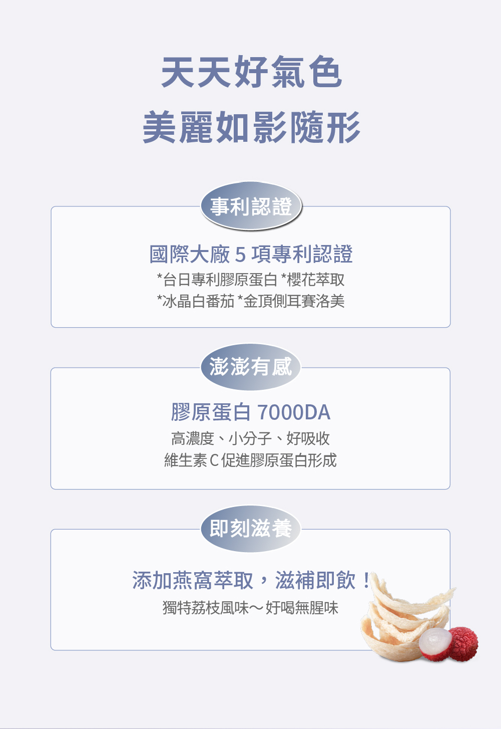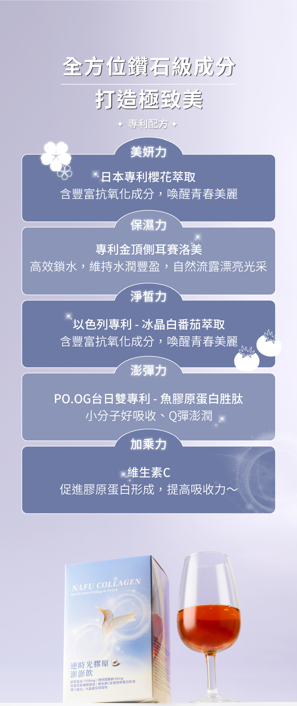 成分:水、膠原蛋白、蘋果濃縮汁、麥芽糖醇(甜味劑)、檸檬酸、荔枝濃縮汁、香料、維生素C、魚膠原蛋白(含彈力蛋白)、蔗糖素(甜味劑)、流行鏈球菌發酵物(含透明質酸鈉)、冰晶蕃茄萃取物、山竹果抽出物(山竹果抽出物、糊精)、金頂側耳萃取物(含賽洛美)(環糊精、金頂側耳萃取物)、燕窩水解物(麥芽糊精、燕窩水解物)、櫻花萃取物(麥芽糊精、櫻花萃取物、抗壞血酸(抗氧化劑)、蘋果酸)